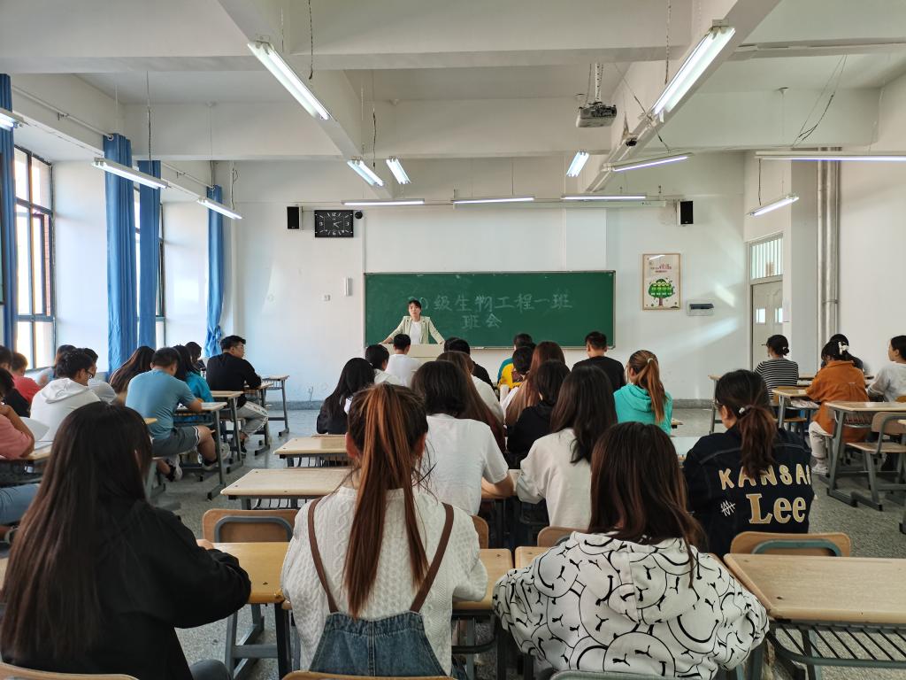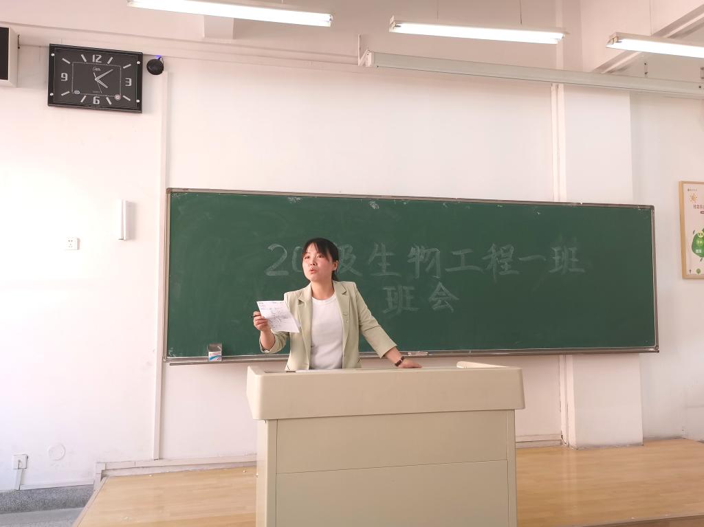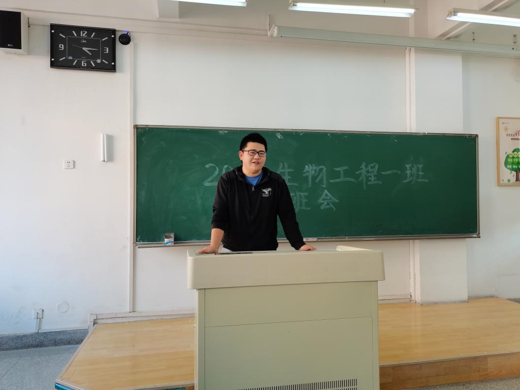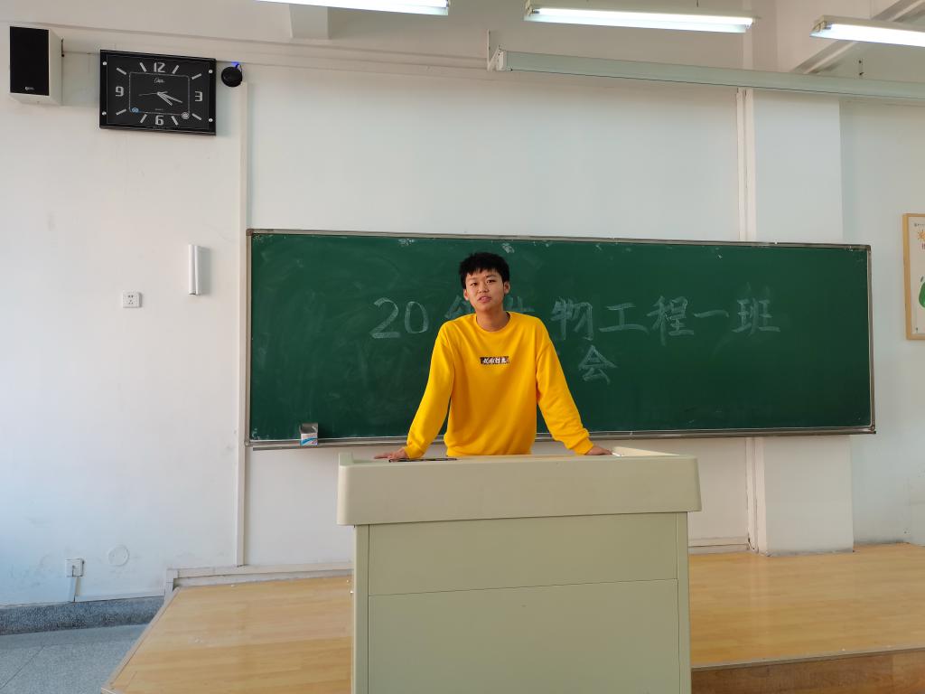 新学期,新气象,学期伊始本班迎来了几位新成员的加入,班会上唐老师首先向同学们介绍了新学期班级里转来的新同学,以及新来到的协助班级事务的王芳老师。而后唐老师针对大一第二学期的班级成绩进行了简要总结,鼓励同学们再接再厉、突破自我。并针对本学期即将开展的创新创业学分认定工作提醒大家尽早行动、认真对待。接着向同学们说明担任了大学第一学年的班长邢译文由于个人意愿选择退职,班级随即进行新班长竞选,通过同学们的民主投票,确定新班长为张卓越同学。竞选结束后,18级生物工程一班王昕再次对考研与成绩问题对同学们进行强调,希望同学们不要辜负自己。最后,班主任唐老师就疫情当下的国庆假期出行安全对同学们进行提醒,班会到此结束。